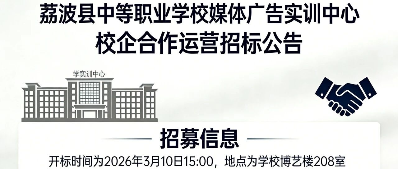 荔波县中等职业学校媒体广告实训中心校企合作运营招标公告 荔波县中等职业学校 继续滑动看下一个 荔波县中等职业学校 向上滑动看下一个 微信公众号(订阅通知) 微信小程序(查询信息) 本公告地址:https://www.ysbid.com/view/21699/O8rorpwBNh59eouldTUR.html 公告原网站链接